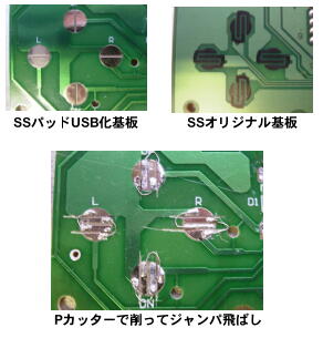 かなり強引ではありますが基板をPカッターで削り取って元々のΦ型からSSパッドと同様の4本くし型に変更し、ジャンパを飛ばしました。